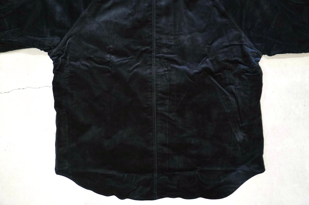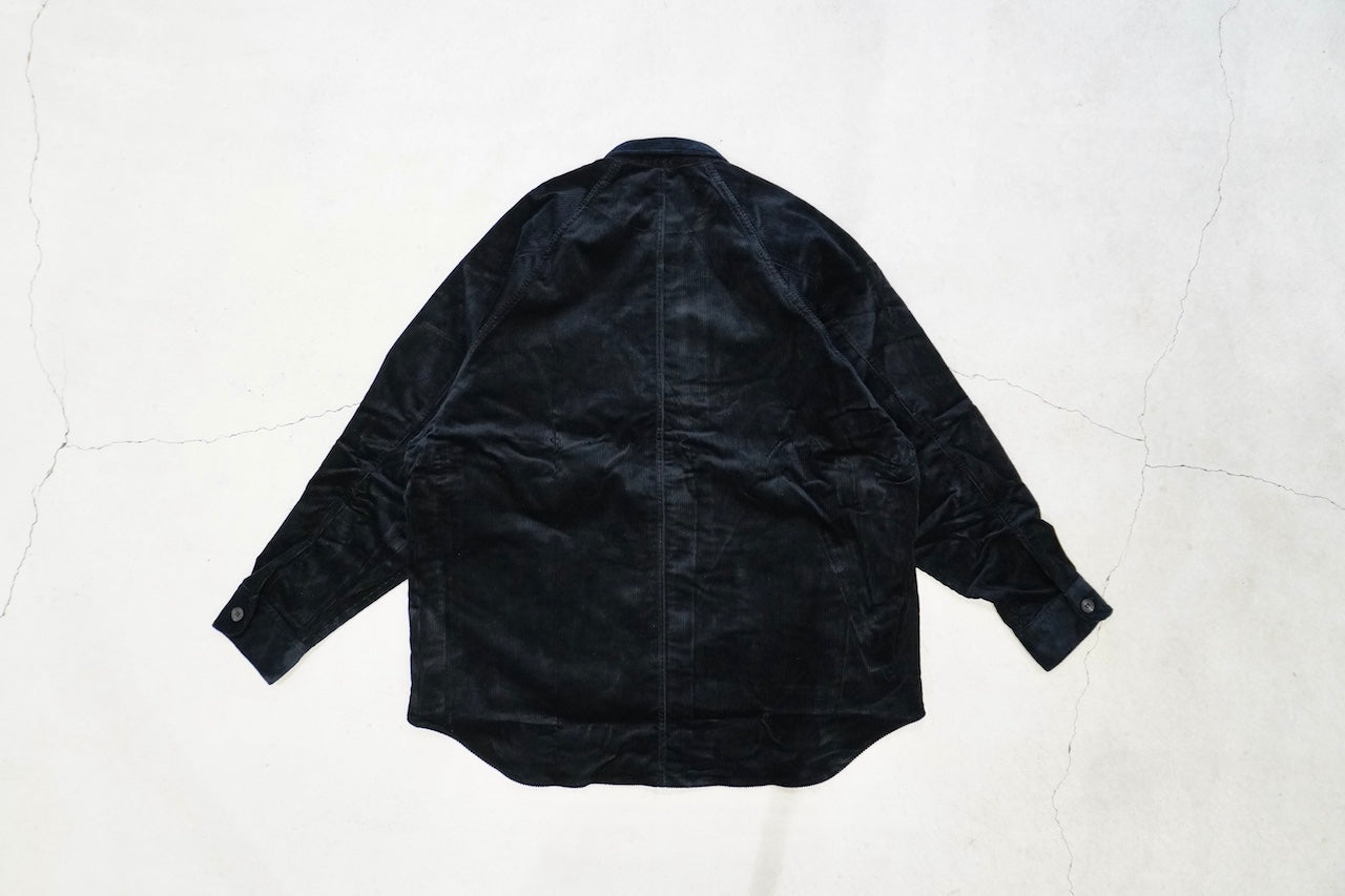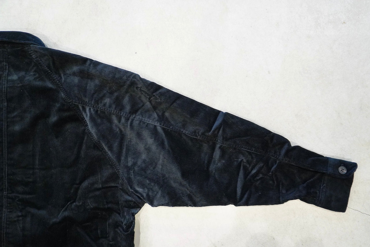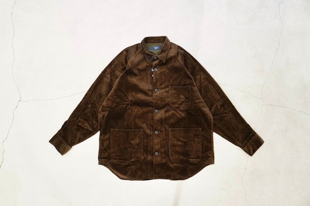 細畝のコーデュロイを生地に使用したシャツはワークウエアのカバーオールタイプのデザイン。ラグラン仕様となった肩にフロントのすそサイドに付けられたパッチポケット、シャツよりも大きな襟やカフスなどカバーオールのディテールをシャツに落し込んだデザインになっています。カバーオールの様にアウターとしてもシャツの様にジャケットやコートのインナーにも使用出来る便利な一枚です。